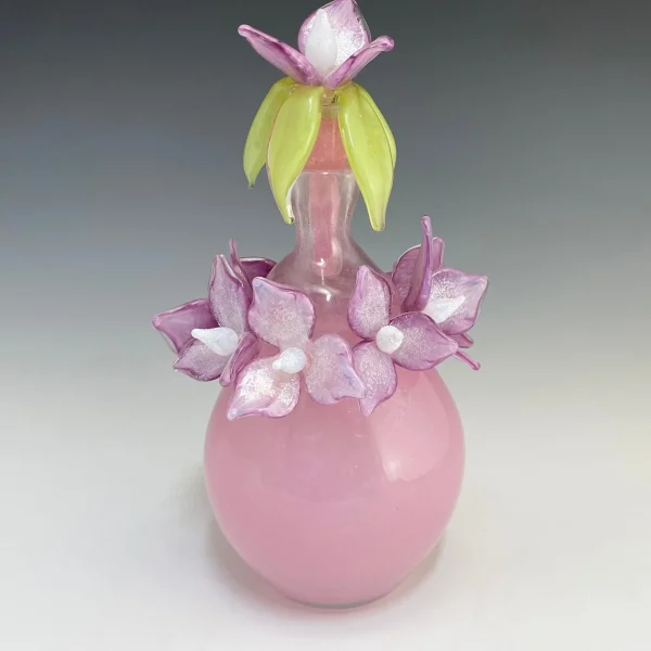 This pink bottle stopper with adorable purple and white flowers has an glittery sparkle that will make a statement anywhere.
