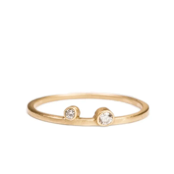 The clean lines and minimalist design make this ring ideal for stacking. It’s also a great choice for a modern wedding or commitment band. Handmade in 14k gold with a satin finish, it features a .02ct and .04ct diamond (.06cttw) in a bezel setting above a narrow, 1.1mm square-edged band. Available in rose gold by special order.