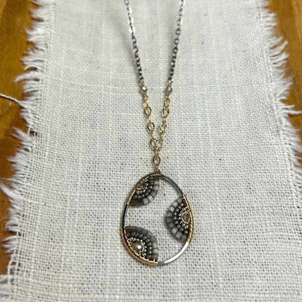 It is all about the details in this stunning mixed metal necklace. Hammered blackened silver with delicate gold wire wrapping with layers of silver beads and gray quartz. Mixed metal chain to complete the look, gold loops to start off transition to silver. Hand wire wrapped labradorite connects to the lobster claw clasp in the back, adding another beautiful moment of detail on this necklace.
