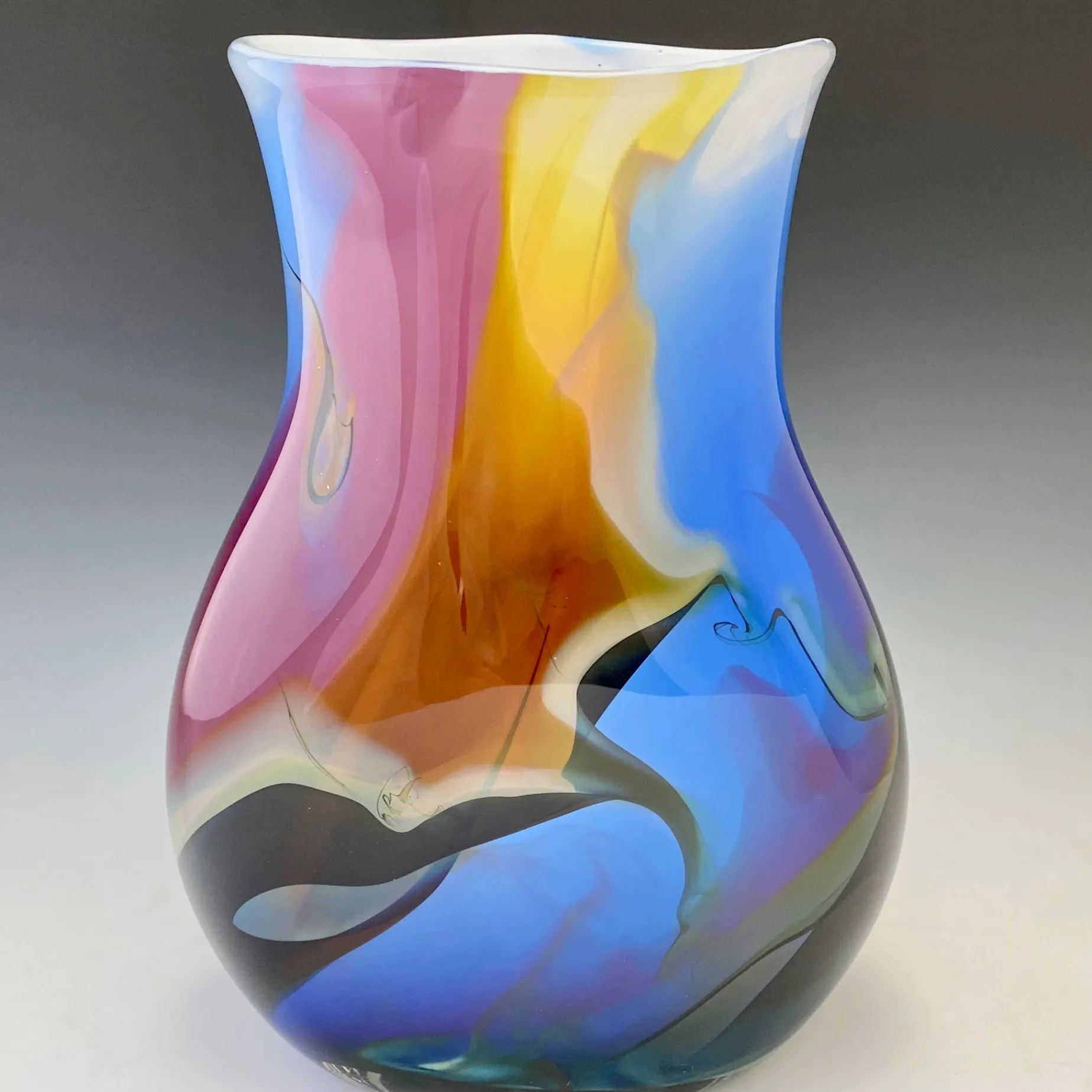 Organic swaths of rich color sweep around this flattened vase, creating a soothing and peaceful texture. 13.25″ tall x 10″ wide x 5″ deep.