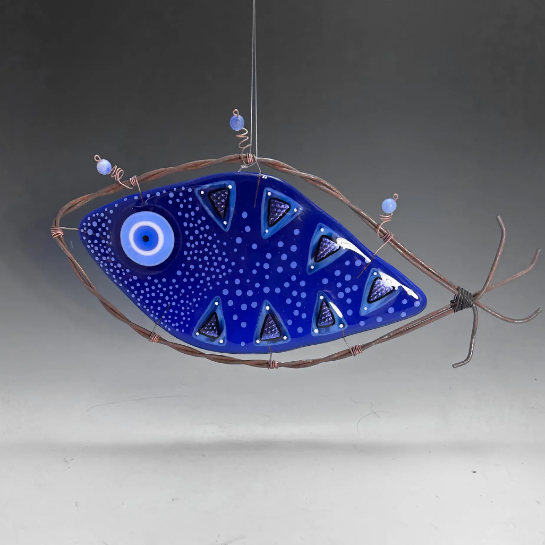 Each piece of glass is hand cut and formed from large sheets, decorated with liquid glass frit, dichroic glass, enamel paints and then fired in a kiln to 1450F to melt together and become one single piece. Her exquisite use of color and comical flair of her subject matter is what sets her work apart in the world of glass art. Cynthia has made many different designs over the years but has settled into the world of fish. Her steel wrapped fish have their big copyrighted round eyes that are easy to spot. Each one is unique and is signed on the back with the SLG marking.