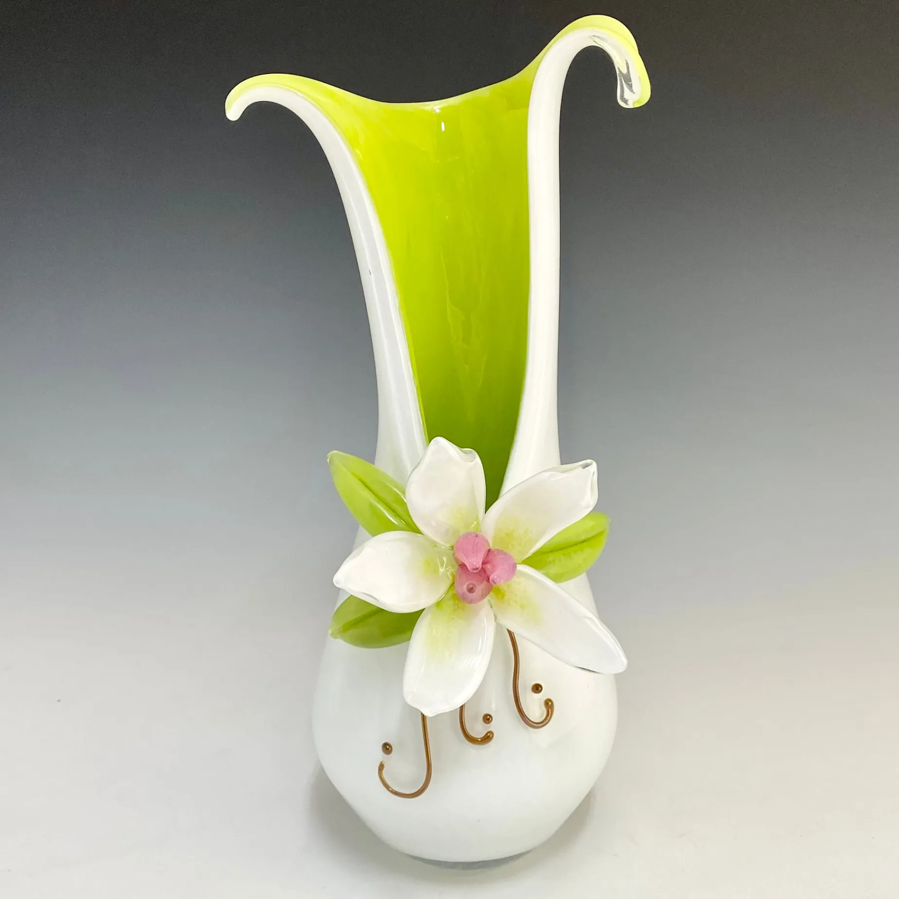 This tall split vase mimics the bend and motion of the flower with its split lip dipping to either side like the lilies swaying in the breeze. Perfect for bedside flowers!