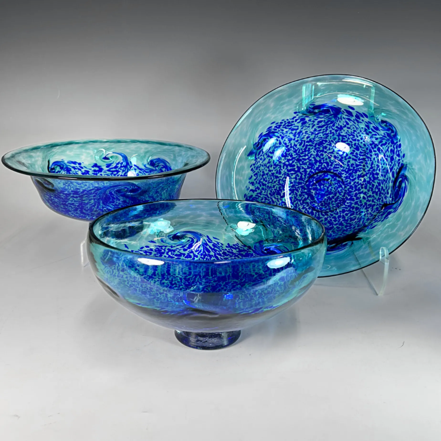 One of our signature designs here at The Glass Station, these stunning bowls feature swirls of rich cobalt on transparent sapphire glass, reminiscent of waves at the beach. This is our Ode to Rhode Island.