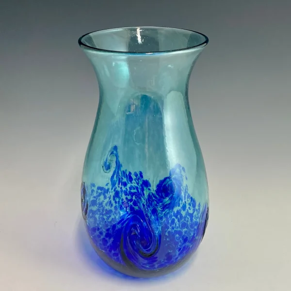 One of our signature designs here at The Glass Station, these stunning vases feature swirls of rich cobalt on transparent sapphire glass, reminiscent of waves at the beach. This is our Ode to Rhode Island.