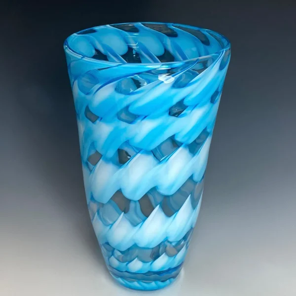 Like clouds passing through a summer sky, white glass and copper blue color are layered and manipulated to create a soft texture on this vase. Display it empty or fill it with a substantial bouquet of flowers to really make a statement. It measures 14″ tall x 8″ wide at the top.